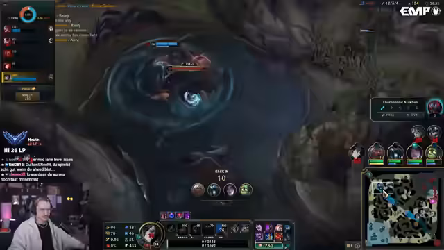 02:08:02Es kommt zu einem kritischen Moment im Spiel, als die Quinn aggressiv vorgeht. Der Streamer schafft es, einen Grab zu sichern und überlebt extrem knapp. Er bedauert, nicht geflasht zu haben, um sicherer zu sein, da er dachte, er könnte mit seinen Fähigkeiten entkommen. Er beschreibt eine Situation, in der er der Kaisa beim Pushen hilft, was jedoch dazu führt, dass sie unter dem Tower in eine ungünstige Position gerät. Er kritisiert die Entscheidung der Kaisa, keinen Free Recall zu nehmen, was zu einem erheblichen Nachteil in Form von verlorenen Gold und Erfahrungspunkten führt. Die Aurora verliert die gesamte Wave, was als „illegal“ und „krass“ bezeichnet wird.