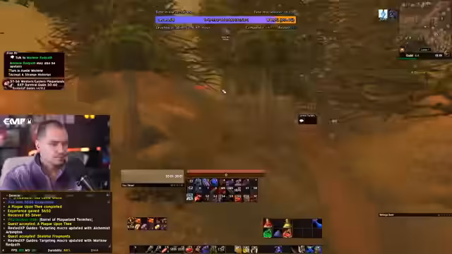 03:38:00Der Streamer konzentriert sich auf das Abschließen von Quests im Eastern Plaguelands. Wichtige Ziele sind das Beschaffen von Skelettfragmenten für die Quest 'Josefs Hochzeitsring' und das Finden von Josephs Ring in einem Grab. Die Insignia für die Quest 'Ein Seuchenfluch' wird ebenfalls erwähnt. Der Fortschritt ist nicht ganz reibungslos, da ein Questmob bereits getötet wurde und das Team den Zielrutger sucht. Es herrscht ein hohes Arbeitspensum, um schnellstmöglich das Level zu erreichen, wobei der Streamer Gold und Nahrungsmittel als essentiell für den Fortschritt bezeichnet.