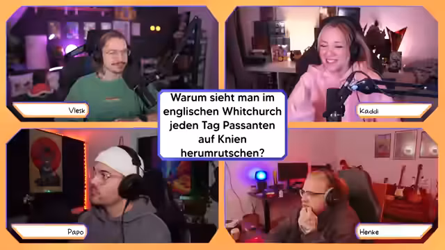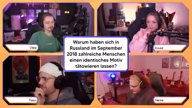 03:38:31Der Streamer, der die Rolle des Hugo Egon Balder übernimmt, stellt die erste Frage: „Warum haben sich in Russland im September 2018 zahlreiche Menschen ein identisches Motiv tätowieren lassen?“ Er klärt auf, dass es sich nicht um eine Protestaktion handelte. Die Teilnehmer spekulieren über mögliche Gründe wie eine Bedrohung, ein Gewinnspiel oder eine Aktion einer russischen Band. Kristo kommt der Lösung näher, indem er die Richtung eines Gewinnspiels einschlägt, ähnlich einer Anekdote, bei der jemand für Geld ein Tattoo gestochen bekam. Die Teilnehmer vermuten, dass es sich um eine Marke handeln könnte, die Rabatte oder Gutscheine für ein Tattoo ihres Logos anbietet. Nach weiteren Spekulationen, darunter auch Wodka-Marken, wird die Lösung enthüllt: Domino's Russland bot 100 Jahre lang kostenlose Pizza (begrenzt auf 100 Stück pro Jahr) für jeden an, der sich einen rot-blauen Dominostein tätowieren ließ. Die Aktion musste aufgrund des unerwartet hohen Andrangs vorzeitig beendet werden, aber viele Menschen genießen nun einen lebenslangen Pizzavorrat. Das Team lobt Papo für seinen entscheidenden Hinweis auf das Gewinnspiel.