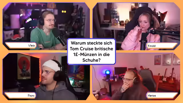 03:52:11Die zweite Frage lautet: „Warum steckte sich Tom Cruise britische Ein-Pfund-Münzen in die Schuhe?“ Kristo vermutet, dass es mit Tom Cruises geringer Körpergröße zu tun hat und er sich auf dem roten Teppich größer wirken lassen wollte. Diese Theorie wird jedoch als falsch abgetan. Papo schlägt vor, dass Tom Cruise die Münzen in seine Schuhe steckte, um am Flughafen den Metalldetektor auszulösen und so mit der Security ins Gespräch zu kommen, da er sich einsam fühlte. Eine weitere Idee ist, dass er die Sicherheitsvorkehrungen bei Events testen wollte. Der Streamer gibt den Hinweis, dass es im weitesten Sinne mit Security zu tun hat, aber nicht auf die vermutete Weise. Es wird spekuliert, ob er die Münzen als Trinkgeld dabei hatte oder wegen eines Kaugummiautomaten schmuggeln musste. Kaddi fragt, ob es wichtig ist, dass es britische Münzen waren, was verneint wird. Die Theorie, dass die Münzen seinen Fußgeruch neutralisieren sollten, wird ebenfalls abgelehnt. Schließlich kommt die Idee auf, dass es mit einem Stunt zu tun hat, bei dem er unter Wasser war, was teilweise richtig ist. Die endgültige Lösung ist, dass Tom Cruise bei einem Stunt in einem Mission Impossible Film, bei dem er waagerecht abgeseilt wurde, Münzen in seine Schuhe steckte, um seinen Unterkörper zu beschweren. Dadurch konnte er verhindern, dass seine Füße den Boden berührten und er in der Waagerechten blieb. Papo hatte die richtige Richtung mit dem Stunt angedeutet.