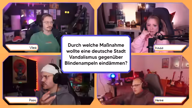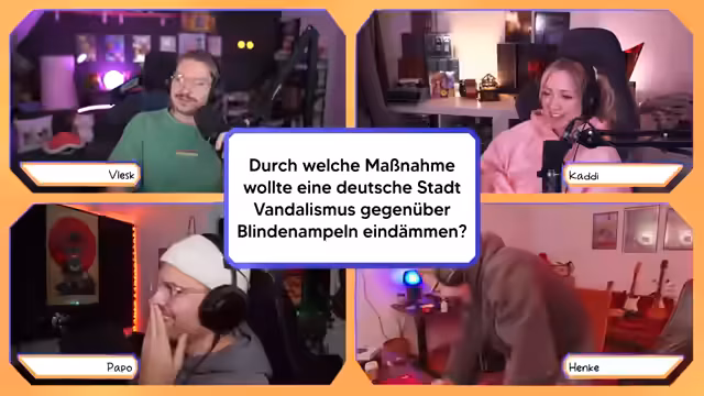 04:21:53Die Runde rätselt über eine ungewöhnliche Maßnahme einer deutschen Stadt, um Vandalismus an Blindenampeln einzudämmen. Es werden verschiedene, teils humorvolle, teils absurde Ideen vorgeschlagen, wie das Einlassen von Lautsprechern in den Boden, NFC-Scanner für Blinde, Elektroschocks für Vandalen oder sogar eine spezielle Lackierung, die Urin zurückspritzen lässt. Die entscheidende Information ist, dass es sich um eine Großstadt handelt und die Stadt selbst wichtig ist. Nach einigen Fehlversuchen und der Nennung von Gelsenkirchen kommt die richtige Lösung ans Licht: In Gelsenkirchen wurden Blindenampeln mit dem Schalke-Logo versehen. Die Idee dahinter ist, dass niemand, der ein Schalke-Fan ist, sein eigenes Vereinslogo beschädigen würde. Diese Maßnahme wurde an einer bestimmten Kreuzung erfolgreich umgesetzt, wo der Vandalismus danach aufhörte. Die Stadt plante, diese Idee auf weitere Blindenampeln auszuweiten, um das Problem des Vandalismus nachhaltig zu lösen.