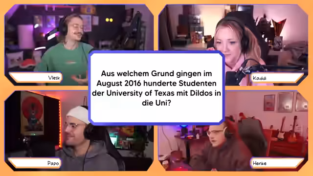 04:36:57Die Frage, warum im August 2016 Hunderte Studenten der University of Texas mit Dildos in die Universität kamen, sorgt für Amüsement und Spekulationen. Zunächst werden humorvolle, aber falsche Theorien aufgestellt, wie etwa ein Sexualkundeunterricht, bei dem Dildos als Lehrmittel dienten. Die korrekte und zugleich scharfsinnige Lösung wird jedoch schnell gefunden: In Texas war es zu dieser Zeit erlaubt, Waffen offen auf dem Campus zu tragen, während Sexspielzeuge verboten waren. Als Protest gegen diese als absurd empfundene Gesetzgebung organisierten Studenten eine Demonstration unter dem Motto „Cox not Glocks“. Sie trugen massenhaft Dildos auf den Campus, um auf die Ungleichheit und die Gefahren des Waffentragens aufmerksam zu machen. Diese Aktion war eine direkte Reaktion auf eine Gesetzesänderung vom 1. August 2016, die das Mitführen von Handfeuerwaffen auf dem Campusgelände erlaubte. Die Demonstration verdeutlichte die Ironie der Situation und die Besorgnis der Studenten über die Sicherheit an ihrer Universität.
