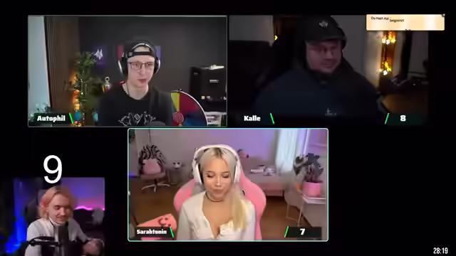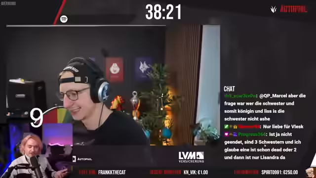 02:56:26Kalle soll zwei Champs aus Bilgewater nennen. Er nennt Graves und Twisted Fate. Er soll drei Champs aus Noxus nennen. Er nennt Darius, Draven und LeBlanc. Er soll sagen, auf welcher Position Uzi in der Hall of Legends spielt. Er sagt AD Carry. Es wird diskutiert, warum Uzi in der Hall of Fame ist. Kalle soll sagen, wie viele unterschiedliche Runenpfade es gibt. Er sagt fünf. Es wird diskutiert, ob Miss Fortune oder Lux mehr Skins hat. Kalle soll sagen, welcher League-Champ er ist, wenn er bei Schere, Stein, Papier immer Stein wählt. Er sagt Malfight. Er soll zwei Geschwisterpärchen in League nennen. Er nennt Darius und Draven und Yone und Yasuo. Kalle soll sagen, wie die Währung heißt, mit der man Champions kaufen kann. Er sagt Blue Essence. Kalle hat gewonnen.