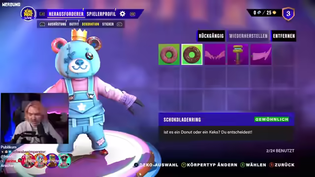 05:43:35Die Gruppe stellt sich einem gefährlichen Ober-Troll und nutzt Bomben und Armbrüste, um ihn zu besiegen. Nach dem Kampf werden neue Dungeon-Pakete freigeschaltet. Es werden Anpassungsoptionen wie Kostüme und Emotes im Spiel erkundet. Ein Spieler erwähnt den Kauf eines Röckchens für seinen Charakter und das Experimentieren mit verschiedenen Emotes und Posen. Es wird überlegt, welche kosmetischen Gegenstände gekauft werden sollen, darunter ein Schokodonut und ein Erdbeerdonut. Ein Spieler erzählt von einem geplanten Outfit mit Latzhose und Turtleneck, das er bisher noch nicht getragen hat. Außerdem wird ein neuer Freund in einem Videospiel gefunden und eine neue Liga freigeschaltet, was den Schwierigkeitsgrad erhöht. Die Gruppe präsentiert coole Posen und entdeckt neue, schwierigere Dungeons. Es wird beschlossen, einen mittelschweren Dungeon namens 'Trampelhöhlen' auszuprobieren.