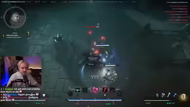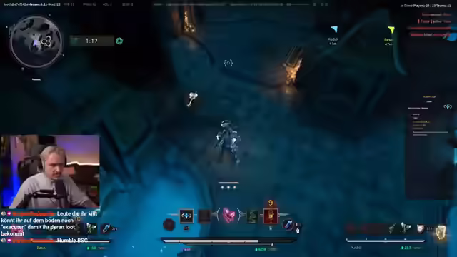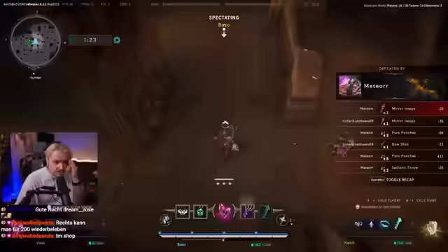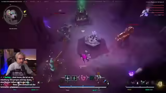 02:58:53Es wird überlegt, Leodins-Items zu nutzen. Rentschi-Sachen werden gedroppt, um einen Set-Bonus zu erhalten. Im Schrein werden Revives gekauft. Es wird gelobt, dass man das Inventar der anderen Leute sehen kann. Es werden verschiedene Kombis ausprobiert. Es gibt viele verschiedene Charaktere mit speziellen Items. Das Ziel ist es, das ganze Set zusammen zu haben, um sich in den Charakter zu verwandeln und übel strong zu sein. Es wird nach PvP und Gegnern gesucht. Ein Spieler wird gestunt und ausgesperrt. Das Team befindet sich in Ebene 3. Die Spieler sind low und scattert. Es wird beschlossen, mehr zusammenzubleiben und sich auf einen Gegner zu fixieren. Es ist schwer, im Kampf den Überblick über alles zu behalten. Die Waffenwahl wird diskutiert. Die meisten spielen Melee. Schnelle Nahkampfwaffen werden bevorzugt. Ein Spieler fühlt sich überfordert. Es wird eingestanden, dass ein bisschen getrollt wurde, was aber nicht mehr passieren wird. Es wird nach der Meta im Spiel gegoogelt. Die Charaktere sind Skins. Es werden Builds im Discord gelesen. Es wird ein Schrein aufgesucht, um etwas zu kaufen. Viele Leute droppen dort. Es wird beschlossen, ein bisschen wegzugehen, da die Gegner bereits Waffen haben. Ein Spieler hat First Blood. Es wird festgestellt, dass die Waffe eine Schlange ist. Ein Spieler ist Afghan. Ein Teammitglied wird gerettet. Es wird versucht, zwischen den Waffen zu wechseln. Das Team ist in Unterzahl und es geht ihnen nicht gut. Es wird ein Heiltotem benötigt. Es wird festgestellt, dass man verschiedene Sockel hat. Es wird versucht, den Gegner zu slowen. Ein Gegner wird getötet. Ein Meteor hat es auf ein Gesicht abgesehen. Es wird überlegt, ob man noch länger warten soll. Ein Resding wird gekauft, kann aber nicht benutzt werden. Es wird gelernt, dass man im Shop für 200 etwas kaufen kann. Es wird versucht, kleine Gegner zu mournen, um Geld zu bekommen. Der beste Freund kommt wieder. Es wird festgestellt, dass das Team ein Talent hat, ihn immer zu finden.