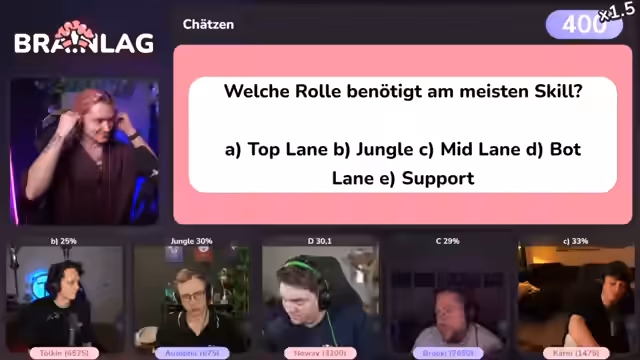 04:11:48Die letzte große Runde beschäftigt sich mit der Frage, welche Rolle in League of Legends am meisten Skill benötigt. Als Optionen werden Toplane, Jungle, Midlane, Botlane und Support genannt. Die Teilnehmer diskutieren intensiv die Unterschiede zwischen Skill-Floor und Skill-Ceiling. Die persönliche Meinung der Streamer variiert, wobei Jungle und Toplane als am schwierigste angesehen werden. Das offizielle Chat-Voting ergibt jedoch, dass mit 30 Prozent die meisten Teilnehmer die Jungle-Rolle für die anspruchsvollste halten. Dies sorgt für weitere Diskussionen über die Popularität und die wahre Schwierigkeit der verschiedenen Rollen.