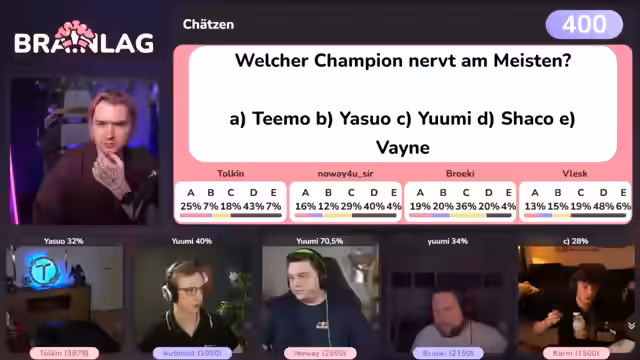 03:46:48Es folgt ein interaktives Chat-Voting zur Frage, welcher deutsche League of Legends-Spieler der 'GOAT' (Greatest of All Time) ist. Die zur Wahl stehenden Kandidaten sind Upset, Broken Blade und Power of Evil. Nach einer Abstimmung mit tausenden Teilnehmern gewinnt Broken Blade mit 49 Prozent der Stimmen. Der Streamer analysiert die Ergebnisse, bemerkt, dass die Stimmen für Power of Evil auf seine früheren Erfolge zurückzuführen sind, und freut sich darüber, den Chat korrekt eingeschätzt zu haben. Tolkien erhält für den richtigen Tipp 400 Punkte.