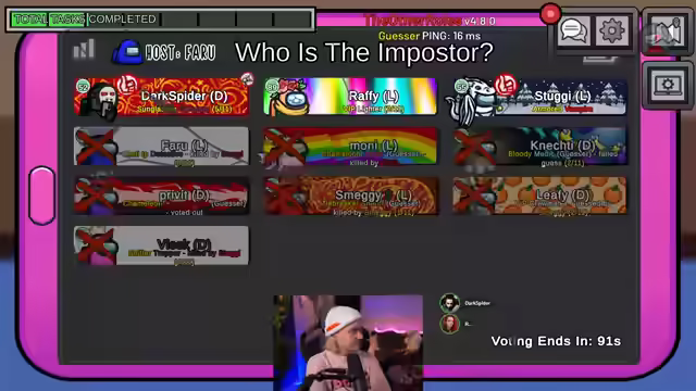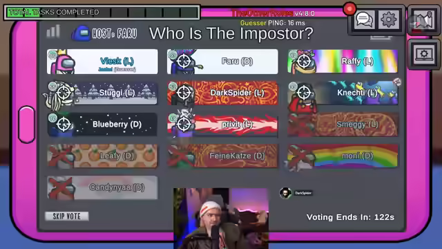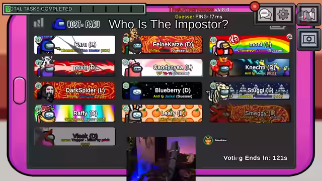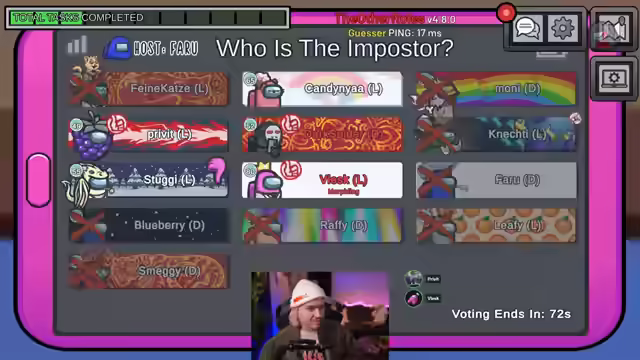01:41:54Es wird enthüllt, dass Smaggy Sheriff ist und auf Ruffy geschossen hat, der möglicherweise ein Jackal oder Imposter war. Es wird diskutiert, ob wählende Personen eher keine Crew-Mitglieder sind. Es wird der Verdacht geäußert, dass jemand versucht hat, einen heimlichen Kill zu machen. Es wird über die Möglichkeit diskutiert, ob das Meeting ausdiskutiert werden soll oder ob einfach gevotet werden kann. Es stellt sich heraus, dass Vlesk Leiter und Medium war. Es wird vermutet, dass Faro nach dem Tod der Person befördert wurde und möglicherweise der Vampir ist. Es wird beobachtet, dass Privet getötet wurde und Dark Spider über die Leiche gelaufen ist. Es wird spekuliert, dass Maggie gesidekickt wurde. Es wird diskutiert, ob Dark Spider den Kill gemacht hat und warum er sich wegen eines Calls verraten sollte. Es wird überlegt, ob Maggie böse ist und ob Dark Spider Jekyll sein könnte. Es wird argumentiert, dass Dark Spider sich nicht als Crew geoutet hätte, wenn er Jekyll wäre. Es wird festgestellt, dass es nur zwei neutrale Rollen gab und die erste bereits raus ist. Es wird Privet beschuldigt, einen Kill begangen zu haben. Es wird gehofft, dass Farou befördert wird und auf jemanden schießt. Es wird festgestellt, dass Vlesk einen Killer getötet hat. Es wird überlegt, wer als nächstes gekickt werden soll. Es wird angekündigt, dass der Stream bald endet. Es wird überlegt, ob die Person Imposter werden soll. Es werden Spenden und Re-Subs erwähnt. Es wird die Fähigkeit des Time Masters erklärt, sich für fünf Sekunden ein Schild zu geben. Es wird beobachtet, dass Dark Spider den Killer gemacht hat und Faro mit seinem Medic-Schild jemanden erschlagen hat. Es wird diskutiert, wer Chameleon ist und wer wen gesehen hat. Es wird gefragt, warum jemand keinen Vote zurückbekommen hat. Es wird vermutet, dass Moni böse ist.