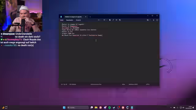 00:16:27Es wird angekündigt, dass es morgen ein King of Meat Placement mit Baso, Tuni und Lumenti geben wird. Für die nächste Woche wird noch Content benötigt, wobei man sich unschlüssig ist, was im Stream gemacht werden soll. Es wird eine alte Gaming-Tierlist-Challenge von No Way erwähnt, bei der man beweisen wollte, dass man kein D-Tier-Gamer ist, indem man in verschiedenen Spielen gut wird. Die ursprüngliche Reaktion auf die Tierlist und die daraufhin formulierten Ziele werden thematisiert: Ascendant in Valorant, Master in League, No-Death-Gauntlet in sieben Soulsborne-Games, Super Mario 64 Speedrun, Master in TFT, Getting Over the Jump King und 1200 Elo in Schach. Es wird diskutiert, welche dieser Ziele realistisch sind und welche zusätzlichen Herausforderungen in eine Mega-Gaming-Tierlist aufgenommen werden könnten. Flappy Bird wird als ungeeignet für einen Grind aufgrund der hohen mentalen Belastung ausgeschlossen. Clash Royale wird kurz angesprochen, aber die Einschätzung einer sinnvollen Elo gestaltet sich schwierig. Es wird der Wunsch geäußert, wieder League of Legends zu spielen und Tristan Schrage als Coach einzuladen, um im Spiel besser zu werden und von Among Us wegzukommen. Es wird erwähnt, dass man morgen bei Autofill in League of Legends der dümmste fliegt dabei ist.