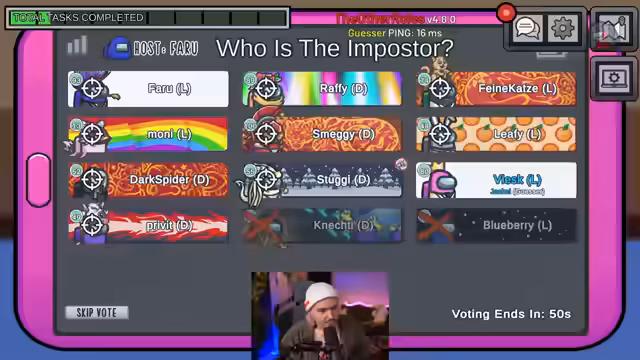 00:44:32Während des Spiels entwickelt der Streamer eine Strategie, die stark von den Rollen in der Lobby abhängt. Er offenbart, dass er manchmal bewusst stark Spieler wie Wolde oder Stugi tötet, um sie aus dem Spiel zu nehmen. Der Grund dafür ist, dass es ihm schwierig fällt, sie zu täuschen, was die Anzahl seiner potenziellen YouTube-Uploads verringern würde. Die Analyse der komplexen Rollen wie Swapper, Vampir und Tracker, die den Spielverlauf massiv beeinflussen, prägt die Entscheidungen der Mitspieler und des Streamers während der Meetings.