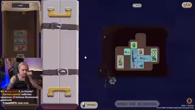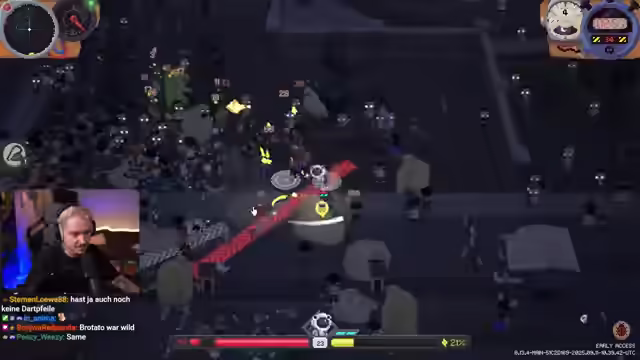04:49:45Es beginnt mit dem Finden eines Flummis und der Möglichkeit, diesen direkt zu verbessern. Eine rote AK wird mitgenommen, und es wird der Rucksack fertiggestellt. Es wird festgestellt, dass der Schaden für die aktuelle Runde sehr hoch sein muss. Die Pumpen werden strategisch platziert, um beide Waffen zu treffen. Es wird festgestellt, dass das Inventar ordentlich sortiert werden muss. Es wird überlegt, ob eine dritte Pumpe benötigt wird. Es wird festgestellt, dass der Charakter vollgetankt ist und für das aktuelle Level nichts mehr benötigt wird. Es wird die Möglichkeit erwähnt, mit der Hantel und zwei Wachen zu arbeiten und noch zwei AKs oder Miniguns in den Build zu integrieren. Die Items sind übersichtlich angeordnet. Es wird festgestellt, dass das Leveln langsamer vorangeht und mehr MP benötigt wird. Ein Twitch-Shop wird aufgehoben und eine Hand gefunden, die es ermöglicht, auf fünf Waffen zu erhöhen. Der Magnet ist aktiviert, um keine EP zu verlieren. Es wird festgestellt, dass der Armor fehlt und Schaden erlitten wird. Der Bus wird aufgesucht, da es zu brenzlig wird. Es wird überlegt, eine Minigun zu bauen, aber die eigene AK dafür zu verwenden, was abgelehnt wird. Items werden verkauft und verbessert. Ein Dynamit wird hergestellt und verbessert. Es wird die Möglichkeit erwähnt, die zwei Miniguns noch in den Build zu integrieren, solange es noch keine Lösung dafür gibt.