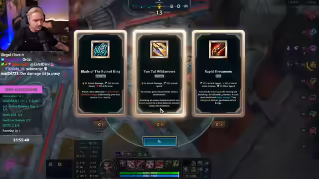 05:51:58Es wird über die Möglichkeit eines erneuten gemeinsamen Streams gesprochen. In der Arena werden verschiedene Strategien diskutiert, darunter die Frage, ob man auf einen Prismatic-Roll gehen soll, um 'Reapers toll' zu erhalten, was als potenziell sehr stark angesehen wird. Alternativ wird überlegt, ob zwei normale Items eine bessere Option wären. Es wird analysiert, inwiefern 'Reapers toll' überhaupt effektiv eingesetzt werden kann, da es an der Fähigkeit mangelt, für den Partner zu tanken und somit verlässliche Angriffsmöglichkeiten zu schaffen. Die Entscheidung fällt letztendlich auf zwei normale Items, da dies als die validere Wahl erscheint. Es wird überlegt, welche Items am besten geeignet wären, wie Lord Dominix oder Mortal Reminder, um Crit-Items zu ergänzen und die Angriffsgeschwindigkeit zu erhöhen. Die Funktionsweise von AP Jinx wird kurz thematisiert, wobei festgestellt wird, dass sie auf Headshots basiert und AD umwandelt. Der Spaßfaktor in der Arena, insbesondere die Möglichkeit für unkonventionelle Builds, wird hervorgehoben. Es wird auch überlegt, ob man nach jeder Runde 500 Gold nehmen soll, was zu einem beträchtlichen Goldvorteil führen würde, oder ob man stattdessen 25% Crit-Damage bevorzugen sollte. Die Wichtigkeit, nicht von bestimmten Gegnern getroffen zu werden, wird betont, und es wird überlegt, wie man die Lulu im gegnerischen Team ausschalten kann.