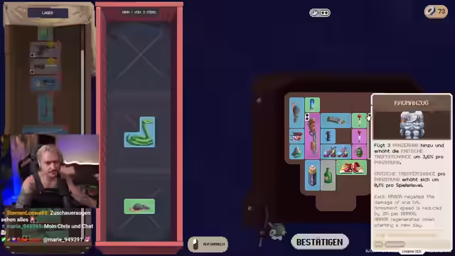 02:07:07Es wird überlegt, welche Verbesserungen im Spiel vorgenommen werden könnten, wobei angemerkt wird, dass es noch zu früh ist, um umfassende Aussagen zu treffen, da noch nicht alle Aspekte des Spiels erkundet wurden. Eine spezifische Kleinigkeit, die angesprochen wird, ist die lange Dauer, die es dauert, Straßenblockaden zu beseitigen. Es wird der Wunsch nach mehr Build-Variety geäußert, da bisher zu wenige Upgrades gefunden wurden. Es wird festgestellt, dass das Spiel bisher gut ist, aber es gibt noch Raum für Verbesserungen. Es wird erwähnt, dass man sich an anderen Roguelikes und Roguelites orientieren könnte, um sich bei Power-Ups inspirieren zu lassen. Es wird überlegt, ob der Twitch-Job wieder aufgehoben wurde, und es wird sich dafür entschuldigt, nicht darauf geachtet zu haben. Es wird überlegt, wie das Inventar optimiert werden kann, um die vorhandenen Gegenstände bestmöglich zu nutzen. Der Mangel an Loot wird als Problem identifiziert, das behoben werden muss, um das Spielerlebnis zu verbessern. Es wird überlegt, ob es sich lohnt, in den Endless-Mode zu gehen, sobald die orangenen und roten Items freigeschaltet sind. Es wird angedeutet, dass der Twitch-Drop sich wie Cheaten anfühlt.