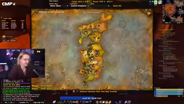 08:06:15Der Fokus liegt darauf, Level 60 zu erreichen, wobei der Fortschritt langsam erscheint. Es wurden Runs durch LBRS und BRD absolviert, jedoch wurden nur geringe Erfahrungspunkte (EP) im Vergleich zur verbrauchten Zeit erzielt. Der Streamer ist sich unsicher über den genauen EP-Fortschritt, da einige Quests möglicherweise nicht korrekt abgeschlossen wurden. Als Ziel für den weiteren Grind wird der Gang durch Maraudon und der Sunken Temple genannt, um das Level zu erreichen und wichtige Quests abzuschließen.
