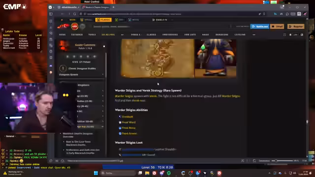 00:37:31Mit Erreichen von Level 58 stellt sich die Frage, ob nun Dungeons wie LBRS (Blackrock Spire) oder BRD (Blackrock Depths) zur schnelleren Erreichung von Level 60 sinnvoll sind. Streamer äußert Bedenken, insbesondere LBRS sei schwer einzuschätzen und das Risiko, als Tank vor Level 60 zu sterben, sei zu hoch. Es wird über eine mögliche LBRS-Gruppe diskutiert, bei der ein starker Magier unerlässlich wäre. Der Fokus bleibt darauf, Level 60 sicher und ohne Tode erreichen zu wollen.