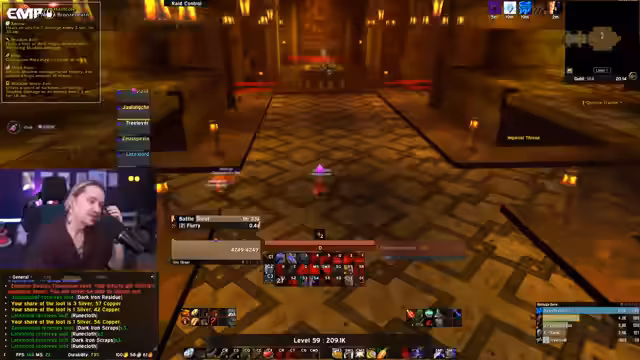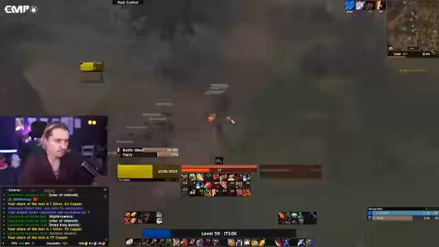 11:53:48Der Fortschritt im Leveling ist ein wiederkehrendes Thema. Der Streamer nähert sich Level 60 und optimiert seine Zeit, indem er Dungeons wiederholt durchläuft, um Erfahrungspunkte (EP) zu sammeln. Ein wichtiger Aspekt ist der gezielte Farmen bestimmter Items mit niedrigen Drop-Chancen, wie ein episches Schwert mit nur 0,19% Drop-Rate. Bei Loot-Verteilungen werden die Bedürfnisse der Klassen berücksichtigt, und es kommt zu spielerischen Streitigkeiten über den Besitz von Items wie den 'Smoldering Claw'.