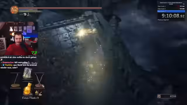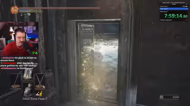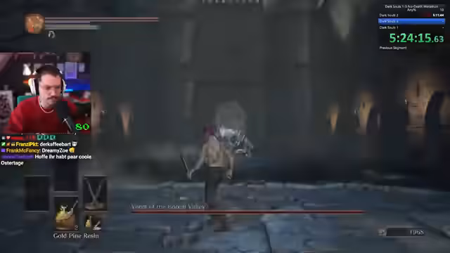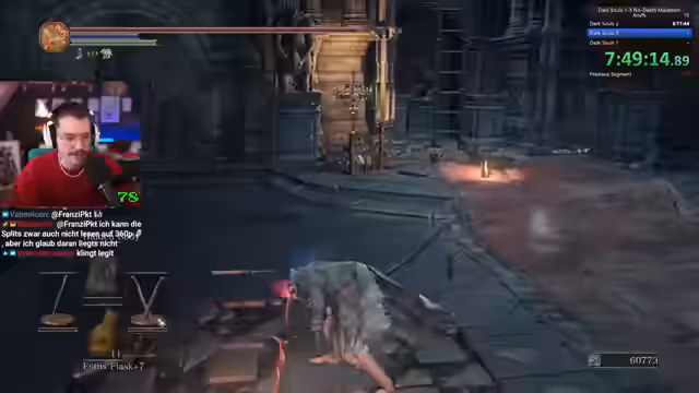 00:04:22Der Stream beginnt mit Ostergrüßen und Ankündigung eines Meilensteins in der Valesk-Videogame-Challenge. Streamer vlesk hat bereits Dark Souls 2 erfolgreich in fünf Stunden und elf Minuten ohne Tod durchgespielt. Nun startet er den Versuch, Dark Souls 3 direkt im Anschluss ebenfalls ohne Tod (No-Death) zu absolvieren, was den Druck erhöht, da jeder Tod bedeutet, dass der gesamte Marathon zurückgesetzt wird.