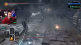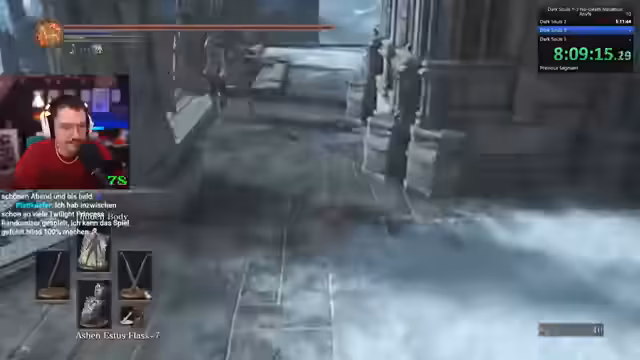 02:40:23Nachdem er eine zusätzliche erste Scherbe in der Irithyll Dungeon gesammelt hat, stellt sich Streamer vlesk dem Dancer. Der erste Versuch scheitert kläglich, da er schnell hohe Schaden erleidet und trotz seiner Taktik, 'Hidden Body' einzusetzen, besiegt wird. Er zählt es als Übungskampf ab. Im zweiten Versuch ist er deutlich vorsichtiger, nutzt seine Ringe und Schilde besser und kann den Dancer nach einem nervenaufreibenden, aber souveränen Kampf besiegen, was ihm den Weg zu Aldrich, Devote of the Deep ebnet.