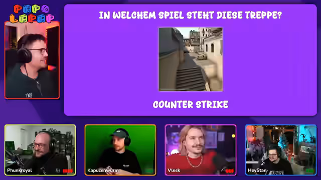 00:39:32Vlesk wählt 'Gaming Step Up 300' (Sound aus Silent Hill 2), Stan beantwortet 'Gaming Step Up 300' (CS:GO-Treppe) und Putzi 'All Around Games 300' (Zelda Ocarina of Time Master Sword). Stan erreicht 1700 Punkte, Putzi 1500 und Vlesk 1100. Funk bleibt mit -1000 im Minusbereich.