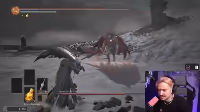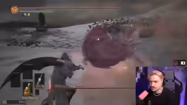 03:05:18Der Streamer startet den Kampf gegen den finalen Boss, dessen Angriffe ihm zunächst unbekannt sind. Er vergleicht die Angriffe mit denen von Gwyn aus Dark Souls 1. Er lernt den Bosskampf on the fly und findet heraus, dass Phase 2 deutlich einfacher ist als Phase 1. Nach erfolgreicher Beendigung des Spiels nach vier Jahren freut er sich über den Sieg und prognostiziert, dass es mindestens einen Spieler geben wird, der das Spiel ohne Tode durchspielt.