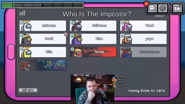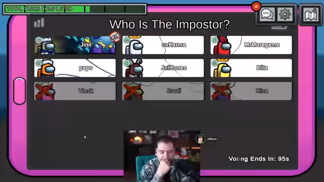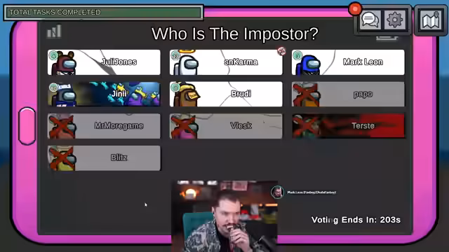 01:21:36Nachdem Papo in Electrical getötet wurde, gibt es einen klaren Verdacht gegen Karma, der auf die Leiche sprang, und Mark Leon, der bei dem Vorfall anwesend war. Spieler wie Vlesk und Brody äußern ihre Vermutungen und es kommt zu einer Abstimmung. Zunächst wird Mark Leon mit der Begründung herausgewählt, ein Impostor zu sein. Kurz darauf wird auch Karma für den Mord verantwortlich gemacht und ebenfalls aus dem Spiel geworfen.