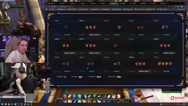 08:03:10Die Auktion der Pakete beginnt, bei der die Völker um die Items bieten. Die Gnome wählen als erstes und erhalten einen Schild, die Menschen eine Tasche. Die Nachtelfen dominieren die Auktion, indem sie hohe Gebote abgeben und wertvolle Items wie eine 16er Tasche ergattern. Der Streamer kommentiert die Auktion live und teilt die Items unter den Völkern auf.
