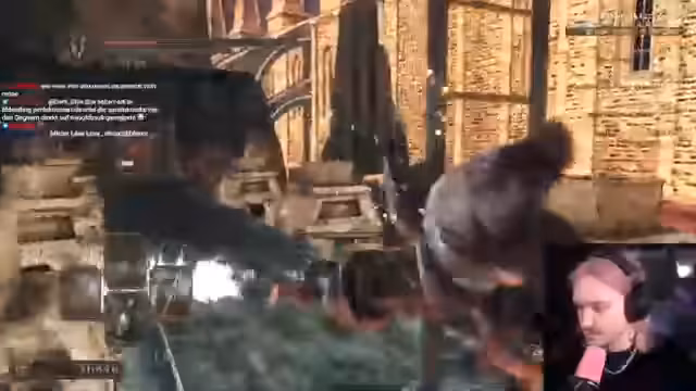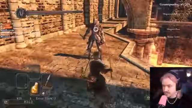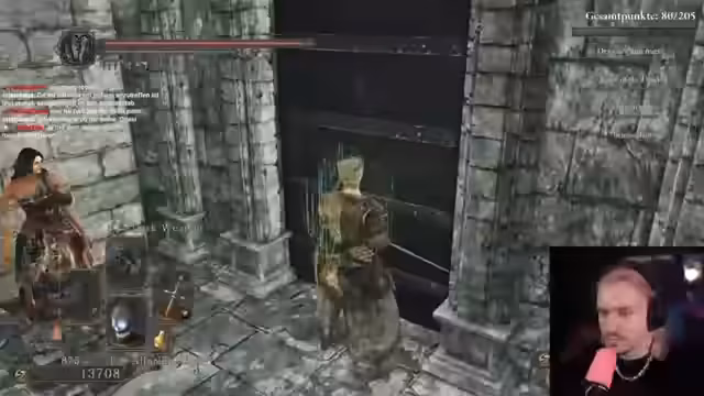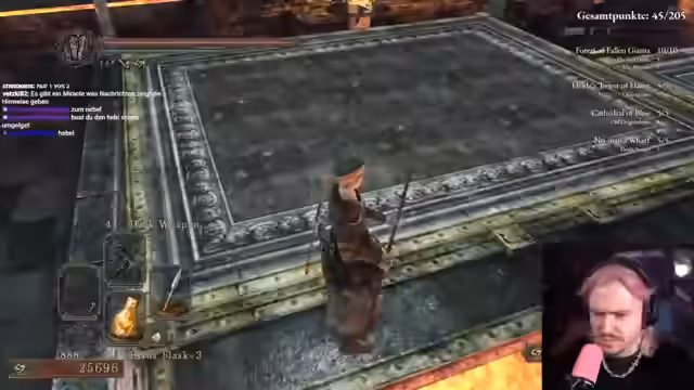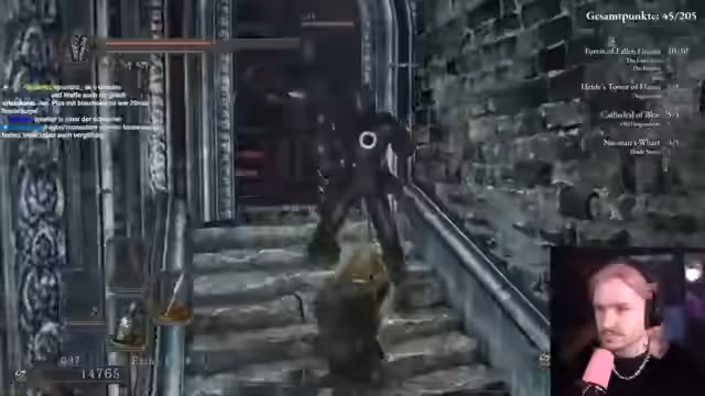 00:14:36Nach einem kurzen Plausch startet der Streamer direkt ins Gameplay von Dark Souls 2. Er spielt einen Level-87 Charakter und möchte seine Waffe, einen Rapier, mit einem Bolt Stone auf Lightning infusen. Da er diesen nicht besitzt, entscheidet er sich stattdessen für eine Poison-Infusion. Auf dem Weg zur Hängebrücke, die zum Boss führt, stürzt er mehrfach ab, was auf mangelnde Konzentration hindeutet. Die Game-Mechaniken des Springens auf die Brückenplattformen und die Angriffe der Gegner stellen anfangs eine erhebliche Herausforderung dar.