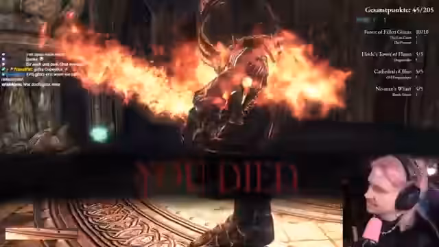 05:14:52Der Streamer beginnt den Kampf gegen Duke's Dear Freya und findet den Boss eklig. Er versucht, auf die Augen des Bosses zu zielen, wird aber von dessen Mund geblockt. Er stirbt, weil er nicht schnell genug wegkommt. Er kritisiert, dass der Boss zwei Gesichter hat und dass dies anatomisch nicht korrekt ist. Der Kampf dauert wieder nur drei Stunden. Er rollt unter den Boss und wird von dessen Arschgesicht getroffen. Sein Schaden ist nicht überragend und sein Rapier ist fast kaputt. Er hat kein Reparaturpulver mehr und seine Fackel hält nur noch eine Stunde und acht Minuten. Er hofft, den Kampf noch vorher zu beenden. Er stirbt fast an den kleinen Spinnen, kann aber nicht rollen. Er besiegt den Boss und erhält eine Great Soul Embrace. Er trifft Aldia und zündet ein Primal Bonfire an. Er muss nun zum Castle, weiß aber nicht mehr, wo es ist. Er beschließt, zum Schmied zu gehen und den Stream für heute zu beenden. Er will das Gift vom Degen entfernen und den Speer upgraden. Er plant, nächste Woche oder am Sonntag weiterzumachen und hofft, den ersten Trainingslauf zu beenden.