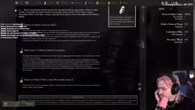 04:00:11Der Streamer erinnert sich daran, dass Patches ihn am Anfang eingesperrt hat und es dort einen Sorcerer Staff gibt. Er macht sich auf den Weg zu den Shaded Woods, um einen Sorcerer Staff zu finden, da er seine Dark Weapon nicht casten kann. Er fragt nach der Anzahl der Bosse in diesem Gebiet und erwähnt Duke's Dear Freya und den Skorpion. Er bittet den Chat, ihn auf Estus Shards und Bone Dust aufmerksam zu machen. Er holt sich Harz von Vengal und sucht nach dem Chlorinthy Ring +1. Er farmt Titanite Chunks und überlegt, ob er Freya zuerst machen soll, um eine +10 Waffe zu erhalten. Er findet ein Bonfire hinter der Rampe, wo er ins Gebiet kam, und entdeckt den Darklurker. Er erkundet das Gebiet weiter, tötet den Scorpion Dude für den Fabring und öffnet eine Geheimtür, um Black Knight Greatsword zu finden. Er überlegt, ob er zum Nebel muss und besiegt einen Gegner, um Ironclad Gauntlets zu erhalten. Er tritt auf einen Schalter und wird von einem Lizard abgeschossen, den er gerne für einen Brocken hätte. Er springt über Plattformen und wird von einer Schildkröte verfolgt.