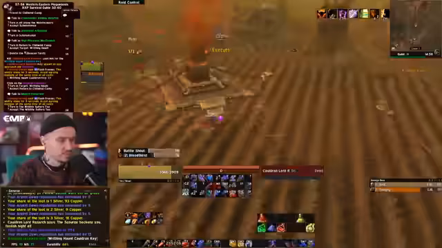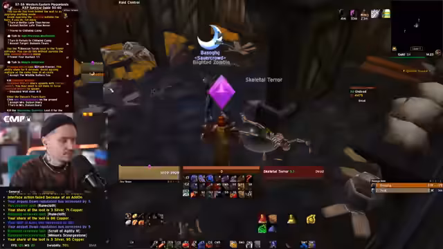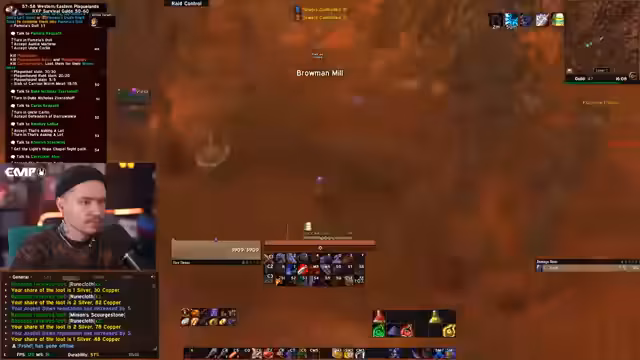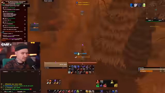04:52:50Im weiteren Verlauf des Streams wird das Farmen von Quest-Items, insbesondere Skelettfragmenten, im östlichen Pestland vorangetrieben. Dabei werden verschiedene Gegnergruppen, wie Skelettkommandos und Akolyten, bekämpft. Der Streamer erwähnt den World-Buff-Timer und dass es zu Layer-Switches aufgrund der vielen Spieler kommen kann. Das Ziel ist, das Level abzuschließen.