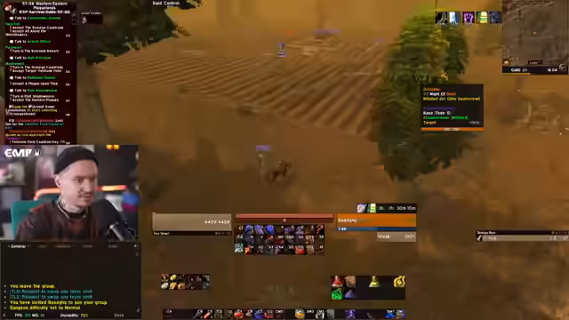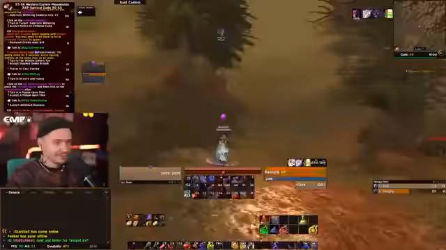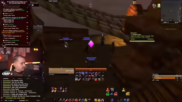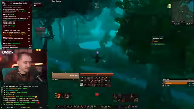 07:39:55Ein Problem entsteht durch das Überfarmen von Quest-Mobs auf dem einzigen verfügbaren Server-Layer. Die Gegner respawnen zu langsam, was den Quest-Fortschritt erheblich verlangsamt. Als Reaktion darauf wird beschlossen, die Quests kurzzeitig zu überspringen und in andere Gebiete auszuweichen, um die Effizienz zu wahren und Zeit zu sparen.