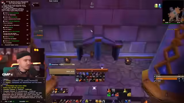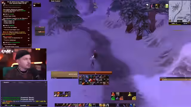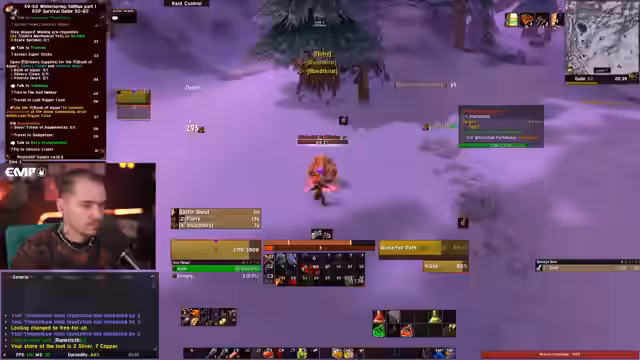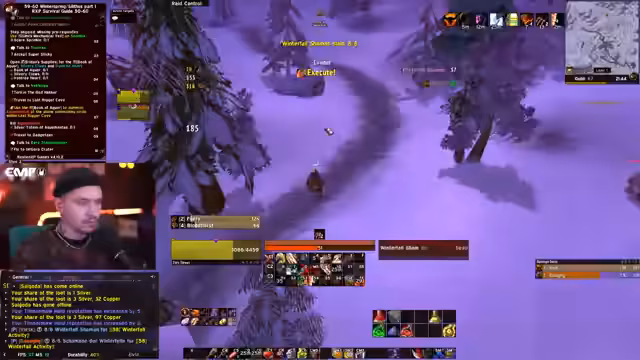 08:46:30Der Stream startet mit einer Warnung vor Elite-Mobs, die jedoch von einem Raid schnell eliminiert werden, was als entspannend wahrgenommen wird. Es geht darum, Kristalle zu looten und vorsichtig zu agieren, um nicht von Klippen zu fallen. Die Hauptschwierigkeit liegt bei der Beschaffung von Yeti-Hörnern für eine Quest, die als nervig und unglücklich beschrieben wird, da die Mobs selten droppen und von anderen Spielern ge-farmt werden. Der Fokus liegt darauf, diese Quest so schnell wie möglich abzuschließen, da sie für den relevanten Raid-Buff erforderlich ist.