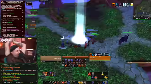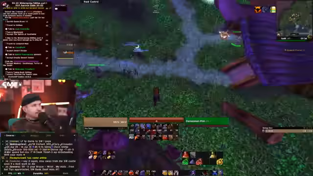 06:26:43Der Streamer wechselt das Ziel und beginnt damit, die World Buffs für eine Raid-Gruppe zu organisieren. Er nutzt Portale, um verschiedene Orte wie Düsterbruch, Silberwald und Eisenschmiede zu erreichen, um die 'DMT-Buffs' wie zum Beispiel den 'Spell Power'-Buff oder den 'Attack Power'-Buff zu holen. Der Prozess erfordert Koordination innerhalb der Gruppe und das Verwalten von Buffs, die entweder ausgerüstet oder gespeichert werden müssen.
