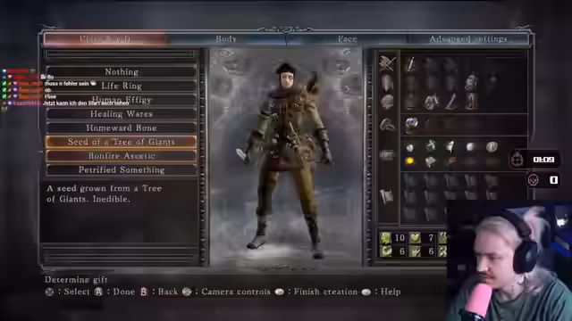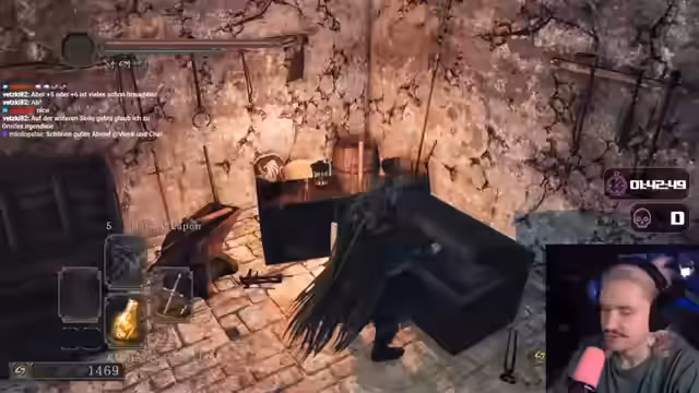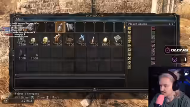 01:58:47Der Streamer hat genug Seelen gesammelt, um sein Equipment und seine Fähigkeiten zu verbessern. Er wechselt Ringe, wertet seinen Degen auf und passt seine Statistiken an. Er zeigt, wie effizient er durch die Level navigiert und welche Strategien er anwendet. Trotz einiger kleiner Rückschläge wie verpasster Items oder vergessener Ausrüstung bleibt er fokussiert. Er nutzt die Fähigkeit 'Dark Weapon' und trifft Entscheidungen im Gameplay, die ihn näher an sein Ziel bringen.