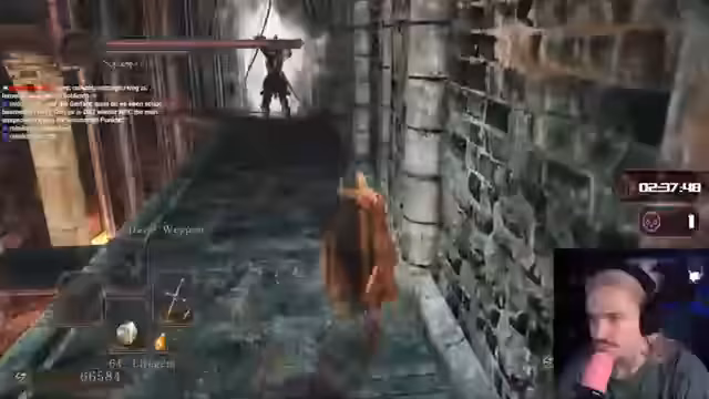 00:46:19Der Streamer startet seinen Death-Run-Zähler und macht sich sofort auf den Weg, um die ersten Bosse zu besiegen. Er trifft auf mehrere Gegner und sammelt Seelen sowie Upgrade-Materialien. Dabei hat er einige Schwierigkeiten, wie z.B. beim Kampf gegen den Pursuer, wo er stirbt und neu anfangen muss. Er zeigt Fortschritte im Levelaufbau und sammelt diverse Items wie Feuerbomben und ein Schwert. Er plant, strategisch vorzugehen und尽量避免 Tode.