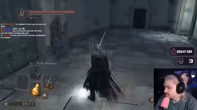 03:50:01Der Streamer macht weiter im Run und bereitet sich darauf vor, die restlichen Bosse zu besiegen. Er geht zu Huntsman's Cops und dann nach Iron Keep. Er erwähnt, dass er normalerweise nicht so viele Seelen bei sich trägt, aber in diesem Run tut er es. Er findet, dass die Gargoyle Kämpfe einfacher geworden sind, da er stärker ist. Er plant, Leo Ring zu bekommen und mehr zu leveln.