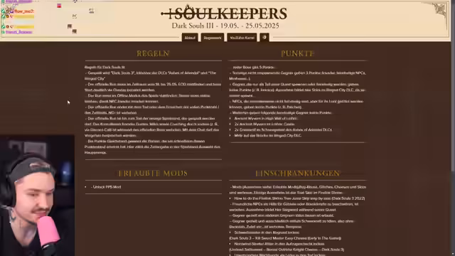 07:27:47Das Rennen neigt sich dem Ende zu. Der Streamer findet schließlich den Friede-Boss und besiegt ihn, erzielt aber nur den dritten oder vierten Platz. Die verbleibende Zeit wird genutzt, um das finale Regelwerk für den kommenden Soulskeepers-Run vom 19. bis 25. Mai zu besprechen. Es wird klargestellt, dass Bugs, Cheeses und das Nutzen von Guides verboten sind, nur ein erlaubter Skip existiert. Nach dem Stream folgt ein Raid zu einem anderen Kanal.
