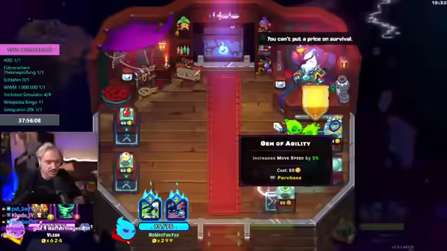 00:35:21Die Gruppe steht vor neuen Herausforderungen, darunter die 'Fickhütte', und diskutiert, wer fehlt und wie man die Ringe wegmachen kann. Es wird festgestellt, dass der Wolf nicht cool ist und dass die Ranged-Spieler einiges für die Gruppe tun können. Die Gruppe diskutiert über die Wahl von Skills und Relikten und entscheidet sich für Relikte. Nach einem nicht perfekten Raum wird überlegt, wer Burning verursacht und welche Halskette am besten geeignet ist. Die Gruppe diskutiert über die Vor- und Nachteile verschiedener Skills und entscheidet sich für solche, die Gegner einfrieren oder betäuben können. Ein Spieler bemerkt, dass er von einem Kollegen verfolgt wird und fast stirbt. Die Gruppe stellt fest, dass die 'Perfect Rooms' mittlerweile knifflig sind. Es wird überlegt, ob man einen Heal-Port kaufen soll, aber ein Spieler kauft stattdessen etwas anderes, was möglicherweise den Boss verstärkt. Die Gruppe kämpft gegen Wehrwölfe und stellt fest, dass sie sehr viel Schaden erleiden. Ein Spieler findet einen Orb, der ihm ermöglicht, wiederzubeleben. Die Gruppe nimmt Max HP und stellt fest, dass ein Spieler sehr viel Schaden verursacht. Es wird überlegt, wie man mehr HP erhalten kann, und die Gruppe hofft auf einen Fountain. Die Gruppe freezt den Raum die ganze Zeit durch und stellt fest, dass Koko nicht balanced ist. Es wird festgestellt, dass es bereits 2 Uhr morgens ist und die Gruppe wieder einen 13-Stunden-Stream absolviert hat. Die Gruppe nimmt HP und beschließt, in den nächsten Morgen die Besten zu sein.