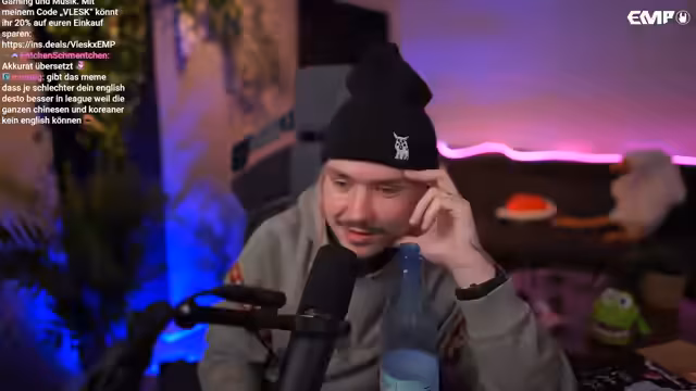 00:07:44Der Streamer begrüßt die Zuschauer und teilt mit, dass er müde ist, da er früh aufgestanden ist, um die League of Legends Weltmeisterschaft zu schauen. Er verarbeitet die Enttäuschung über die schwachen Leistungen der europäischen Teams und beschließt daher, selbst League zu spielen. Er fühlt sich als "Europas nächste Hoffnung" und möchte seinen Rang im Spiel verbessern. Er erwähnt auch, dass er das Gefühl hat, die Leistungen von EU-Teams bei den Worlds seien ihm eine Lektion.