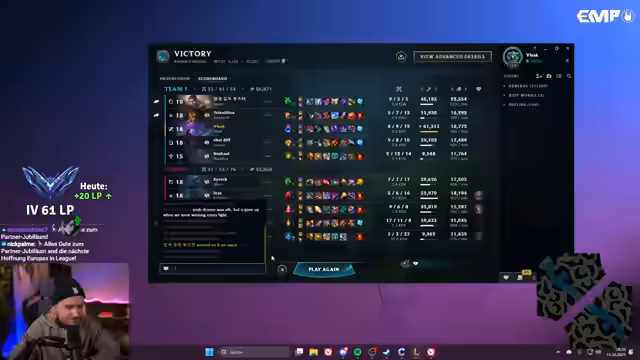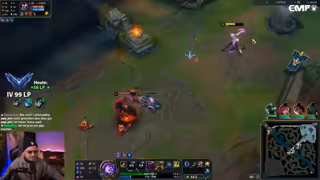 00:33:01Nach einigen technischen Problemen startet der Streamer in die League of Legends-Partien. Er spielt die Champions Nautilus und Karthus auf der Mid-Lane und klagt über seine schlechte Konzentration und Form nach einer längeren Pause vom Spiel. Er beschreibt die Matches als stressig und voller Fehler, bei denen er sich von seinem Team oft "carryn" lassen muss. Trotzdem gelingt es ihm, mehrere Spiele in Folge zu gewinnen und sich seiner Promotion zu Diamond 3 zu nähern.