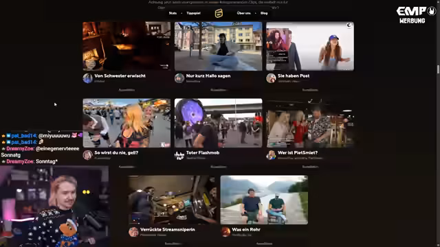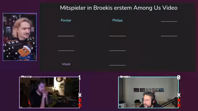 Nach Planungsherausforderungen für ein großes Quiz-Format wurde eine 1-gegen-1-Alternative mit Kutscher und Broeki entwickelt. Das Duell, moderiert von vlesk, testet Wissen in Kategorien wie Länder mit Himmelsrichtung, Among Us Mitspieler und europäische Währungen. Die Teilnehmer kämpfen um Punkte, wobei drei falsche Antworten zum Ausscheiden führen. Eine IMP-Partnerschaft und das Unboxing von Merchandise-Artikeln ergänzen das Programm.