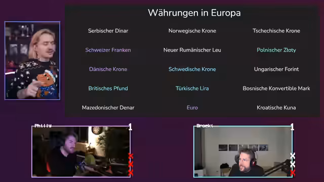 01:04:28Die dritte Quiz-Runde dreht sich um Währungen in Europa, wobei Philipp den Anfang macht und den Euro nennt, gefolgt von Daniel mit dem englischen Pfund und Philipp mit dem Schweizer Franken. Daniel ergänzt mit dem polnischen Zloty. Philipp versucht es mit 'Kronen', was jedoch nicht akzeptiert wird, da er das Land nicht nennt, woraufhin er die schwedischen Kronen präzisiert. Daniel nennt die türkische Lira, was korrekt ist. Daniel fragt nach der bulgarischen Währung, dem Lew, der jedoch nicht auf der Liste des Moderators steht. Daniel hat zu diesem Zeitpunkt vier richtige Antworten, während Philipp zwei Kreuze hat. Daniel versucht es mit den rumänischen 'Schlatti', was falsch ist, und erhält sein drittes Kreuz für 'Rubel', da Russland nicht vollständig zu Europa gezählt wird. Die Runde geht an Daniel, der vier richtige Antworten hatte, während Philipp mit drei Kreuzen ausscheidet. Der Streamer listet die weiteren richtigen Antworten auf: serbischer Dinar, dänische Krone, mazedonischer Dinar, norwegische Krone, neue rumänische Leu, tschechische Krone, ungarischer Forint, bosnische Konvertible Mark und kroatische Kuna. Es wird kurz diskutiert, ob der bulgarische Lew noch zählt, da er erst 2026 durch den Euro ersetzt wird, aber der Punkt bleibt bei Daniel.
