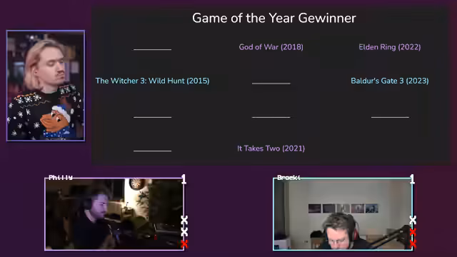 01:11:26Die vierte Quiz-Runde konzentriert sich auf die Game of the Year Gewinner seit 2014, ein Thema, das Daniel als sein Fachgebiet bezeichnet. Daniel beginnt mit Witcher 3, was korrekt ist. Philipp nennt It Takes Two (2021) und Baldur's Gate 3 (letztes Jahr), die beide richtig sind. Daniel versucht es mit Red Dead Redemption 2 und GTA 5, die beide falsch sind, und erhält zwei Kreuze. Philipp nennt God of War, was ebenfalls korrekt ist. Daniel überlegt und nennt Minecraft, was falsch ist und ihm sein drittes Kreuz einbringt, wodurch er ausscheidet. Philipp nennt Elden Ring (2022), was richtig ist. Philipp gewinnt somit die Runde. Der Streamer listet die weiteren Game of the Year Gewinner auf: Dragon Age Inquisition (2014), Overwatch (2016, das einzige Multiplayer-Spiel), Legend of Zelda Breath of the Wild (2017), Sekiro: Shadows Die Twice (2019), Last of Us Part 2 (2020) und Astro Bot (2024). Er empfiehlt humorvoll Expedition 33 als zukünftigen Game of the Year Gewinner und schließt die Runde mit dem Zwischenstand von 2 zu 1 für Philipp ab.