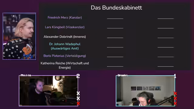 01:18:59Die Quizrunde startet mit dem Thema Bundeskabinett, wobei die Teilnehmer ihre Kenntnisse über die aktuellen Minister testen. Es zeigt sich schnell, dass dieses Thema eine Herausforderung darstellt, da viele Namen und Positionen schwer zuzuordnen sind. Daniel versucht es mit Friedrich Merz und Lars Ricken, die jedoch nicht dem aktuellen Kabinett angehören. Philipp kann einige Namen nennen, darunter Pistorius als Verteidigungsminister. Die Schwierigkeit, die genauen Namen und Ressorts zu benennen, führt zu einer angeregten Diskussion über die Komplexität der Politik und die Bekanntheit einzelner Politiker. Letztendlich kann Philipp mehr richtige Antworten liefern und sichert sich den Punkt in dieser Kategorie, während Daniel Schwierigkeiten hat, die Minister korrekt zuzuordnen.