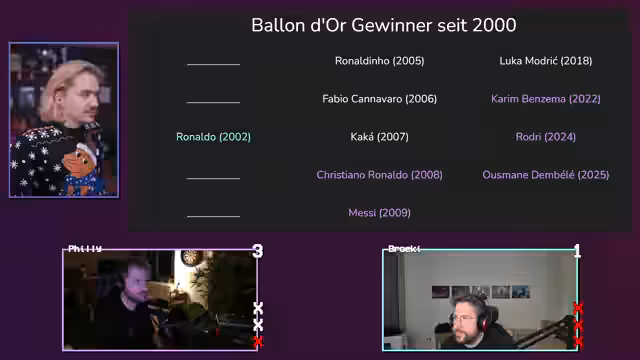 01:26:57Die nächste Kategorie widmet sich den Ballon d'Or-Gewinnern seit dem Jahr 2000. Daniel beginnt mit Ronaldo, gefolgt von Messi, genannt von Philipp. Es wird klargestellt, dass mehrfache Gewinner nur einmal auf der Liste erscheinen. Daniel versucht es mit Mbappé, was jedoch falsch ist, da er in den genannten Jahren noch nicht gewonnen hatte. Es folgen weitere Versuche wie Zidane, der jedoch vor 2000 gewann, und Xavi, der ebenfalls nicht korrekt ist. Philipp kann mit Cristiano Ronaldo einen weiteren richtigen Namen nennen. Die Diskussion dreht sich um die Schwierigkeit, alle Gewinner seit 2000 zu erinnern, insbesondere da einige Spieler wie Sammer vor diesem Zeitraum ausgezeichnet wurden. Die Runde endet mit einer Auflistung der Gewinner, darunter Modric, Cannavaro, Ronaldinho, Shevchenko, Nedved, Michael Owen und Luis Figo, wobei kein deutscher Spieler auf der Liste steht, was für Verwunderung sorgt.