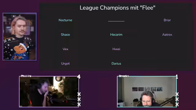 01:31:04Die dritte Quizkategorie dreht sich um League of Legends Champions, die den 'Flee'-Effekt auslösen können. Philipp beginnt mit Fiddlesticks, was jedoch zu einer Klärung führt, da es einen Unterschied zwischen 'Fear' und 'Flee' gibt. Nach einer kurzen Überprüfung wird festgestellt, dass Fiddlesticks den 'Fear'-Effekt besitzt und somit nicht auf die Liste gehört. Daniel nennt Way, was korrekt ist, gefolgt von Hecarim, der ebenfalls richtig ist. Es wird eine kurze Diskussion über die genaue Definition von 'Flee' geführt, wobei vermutet wird, dass es sich um 'Fear' mit einem zusätzlichen Movement Speed Slow handelt. Weitere richtige Antworten sind Briar, Darius, Aatrox, Shaco, Nocturne und Vex. Die Runde zeigt, dass die Teilnehmer ein gutes Wissen über die Champions und ihre Fähigkeiten haben, obwohl die Unterscheidung zwischen 'Fear' und 'Flee' anfangs für Verwirrung sorgte. Am Ende fehlen noch einige Champions auf der Liste, darunter Warwick.