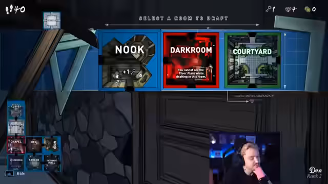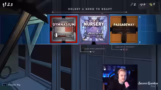02:12:03Nachdem der Plan für einen Boss Rush in Dark Souls 3 verworfen wird, entscheidet sich der Streamer für ein neues Spiel. Er wählt 'Blueprints', ein Rätsel- und Roguelike-Spiel, das er erstmals spielen wird. Er stellt die Spielmechanik vor: Man erbt eine Villa und muss diese durch Platzieren von Räumen auf einer Blaupause ausbauen, um einen geheimen 46. Raum zu finden. Die Herausforderung besteht darin, mit einer begrenzten Anzahl an Schritten die Räume zu betreten und Rätsel zu lösen. Der Streamer beginnt direkt mit dem ersten Raum.