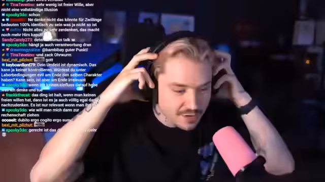 01:40:05Der Streamer stellt sich philosophische Fragen über den freien Willen. Er überlegt, ob unser Verhalten und unsere Gedanken durch Genetik und äußere Einflüsse vorbestimmt sind. Wenn dem so wäre, stünde die Frage im Raum, wie man Menschen für ihre Taten zur Rechenschaft ziehen kann. Letztlich kommt er jedoch zu dem Schluss, dass diese Frage rein philosophisch ist und für sein praktisches Leben irrelevant bleibt, da er ohnehinen keinen Einfluss darauf hat.