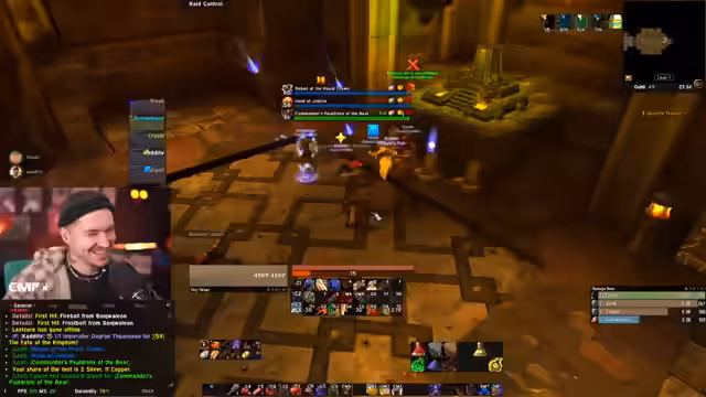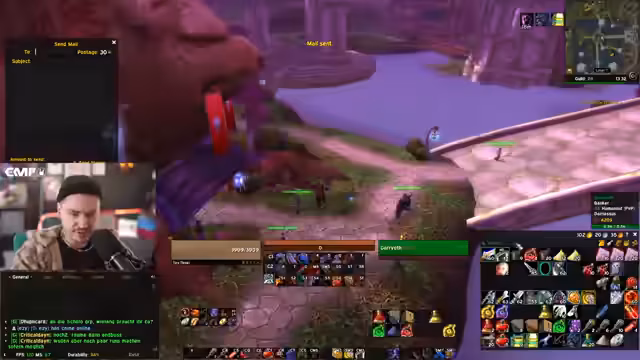 09:07:43Der Streamer schildert ein technisches Problem, bei dem er das Spiel aufhängen muss und eine abenteuerliche Abkürzung findet, indem er im Chat aufsteckt und sich wie ein Stein verhält. Er überlegt, ob das sogenannte 'Bubble'n' (einen heilenden Schild auflegen) eine gute Alternative gewesen wäre, um seinen Mitspieler Freddy vor dem Tod zu retten. Er äußert den Wunsch, er könnte die Leute remote coachen, und klagt über den Stress der Raid-Organisation mit 40 Streamern.