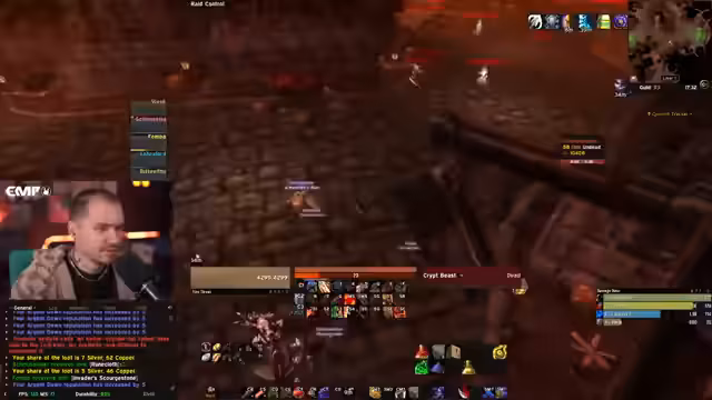 01:42:07Zu Beginn des Streams konzentriert sich der Streamer auf das Sammeln von Rare-Equipment in einem Dungeon. Es kommt zu einem sehr chaotischen und hektischen Kampf mit einer Gruppe von fünf Skeletten und zwei Gargoyles. Der Streamer beschreibt, dass die Situation extrem knapp war, da er massive Aggro von bis zu 800 Monstern hatte und seinen Puls auf 480 steigen sah. Die Zusammenarbeit im Team ist entscheidend, da die Mobs nicht untereinander sozial verlinkt sind, was das Pullen erschwert. Der Streamer nutzt Target Dummies und Eisfallen, um die Situation zu kontrollieren und droht bei einem Fehler zu sterben.